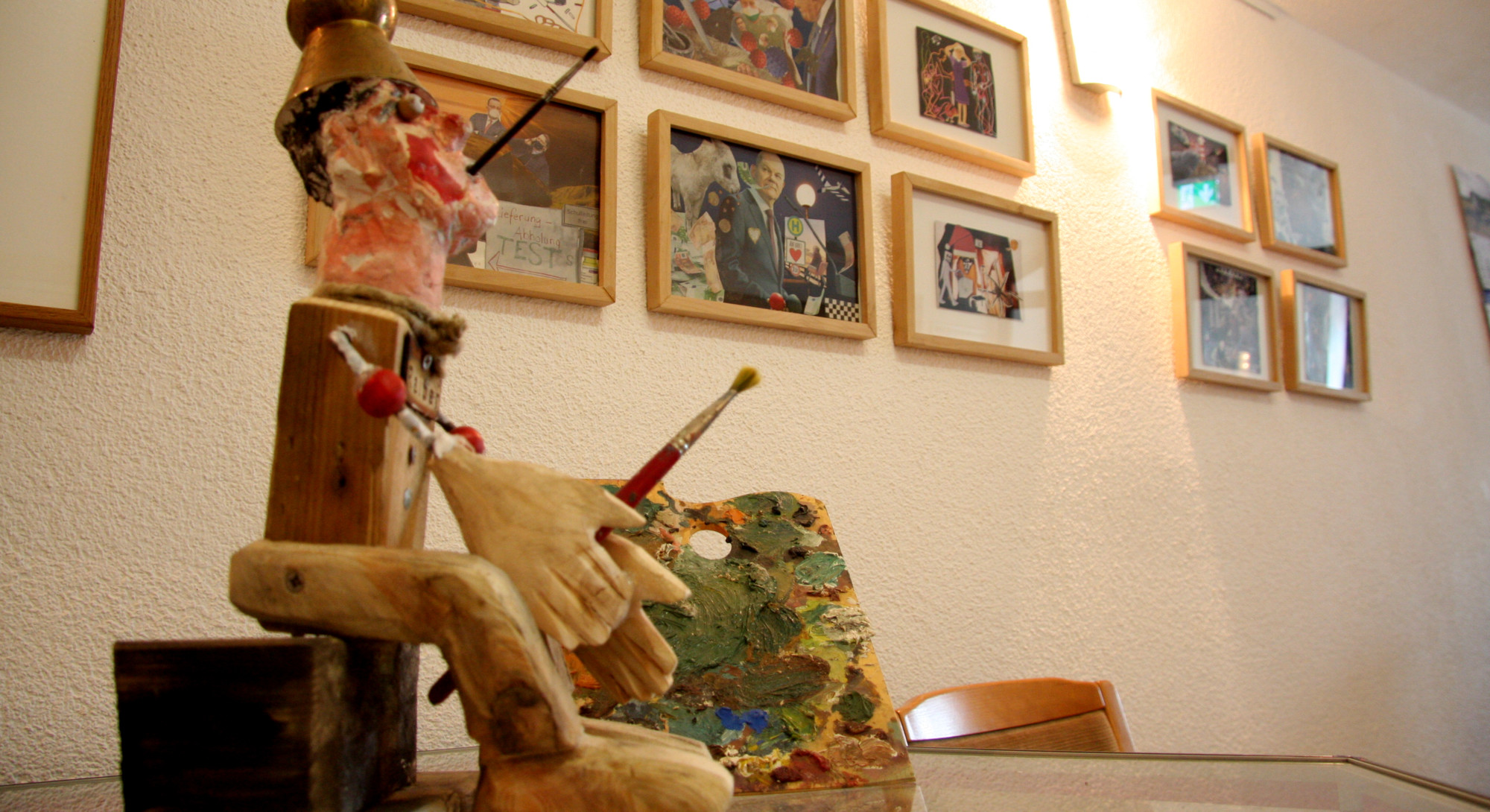 Es gab viel zu verarbeiten. Das Künstlerehepaar, Kristina und Jürgen Raiber entschloss sich die Ohnmacht des Pandemie-Stilstandes in Collagen auszudrücken. Kurzerhand wurde der große Küchentisch zum kreativen Treffpunkt, der Grundstock der späteren Werke aus Zeitschriften, Tagespresse oder abgelaufenen Adventskalendern geschnitten. Es entstand ein großes Reservoir aus Zeitungsstücken und anderen Materialien, mit welchen Kunstwerke geschaffen wurden, die die mentalen, tagesaktuellen und weltpolitischen Herausforderungen der Pandemie zeigen. Jürgen Raiber, der genau wie seine Frau in Nordhausen, Thüringen, geborene Maler, Grafiker, Bildhauer und Absolvent des Meisterschülerstudiums bei Werner Tübke unterstützte seine Frau bei der Arbeit und ließ in seine wenigen Werke überwiegend eigene Grafiken und verschiedene Materialien einfließen. Neben den Collagen beider Künstler kennzeichnen die dreidimensionalen Plastiken des Künstlers, in welchen verschiedenste Materialien verbaut sind, die Ausstellung. „Die Versionen des Kaspers sind eine Reminiszenz des Künstlers an seine Kindheit im thüringischen Südharz.“, erklärte Kristina Raiber im Dialog mit dem Publikum.