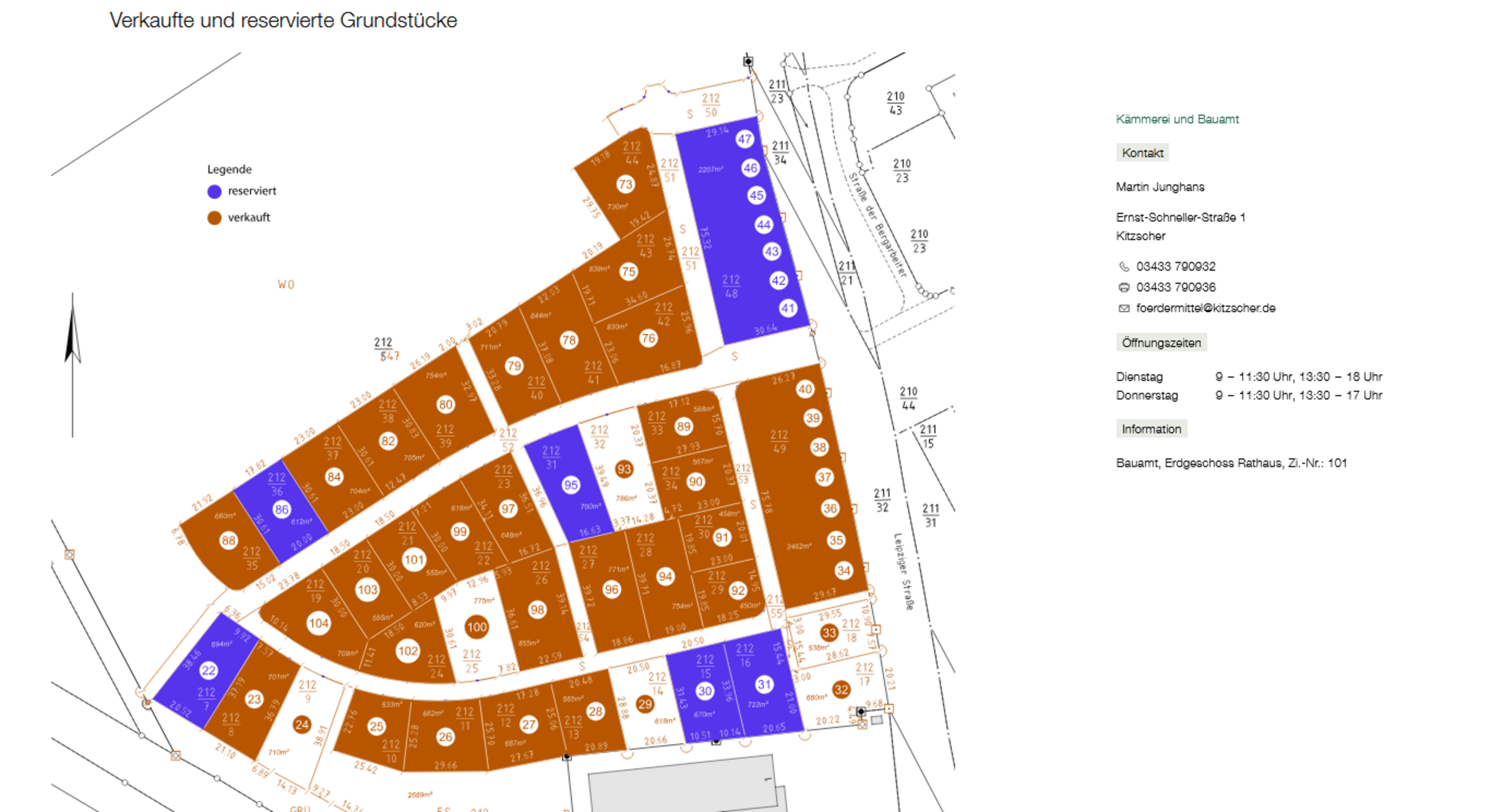 Sie können auch zu den bekannten Sprechzeiten oder nach einer Terminvereinbarung persönlich bei Herrn Junghans im Bauamt des Rathauses Kitzscher, Zi.: 101, vorsprechen. Die Baugrundstücke sind im Lageplan nummeriert, die farbliche Markierung zeigt ihnen den aktuellen Verkaufsstand.